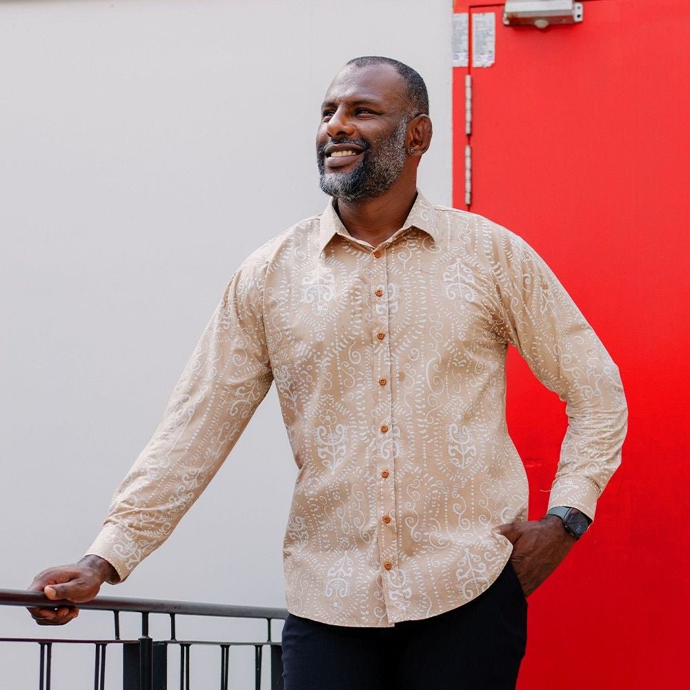 Men's Long-Sleeved Batik Shirt - Tan Petola