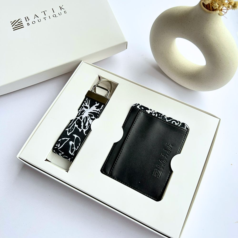 This genuine leather card case and key fob in a gift set are lined with authentic Malaysian batik cotton in black and white is the perfect unisex corporate gift for the one who likes to stay organized.