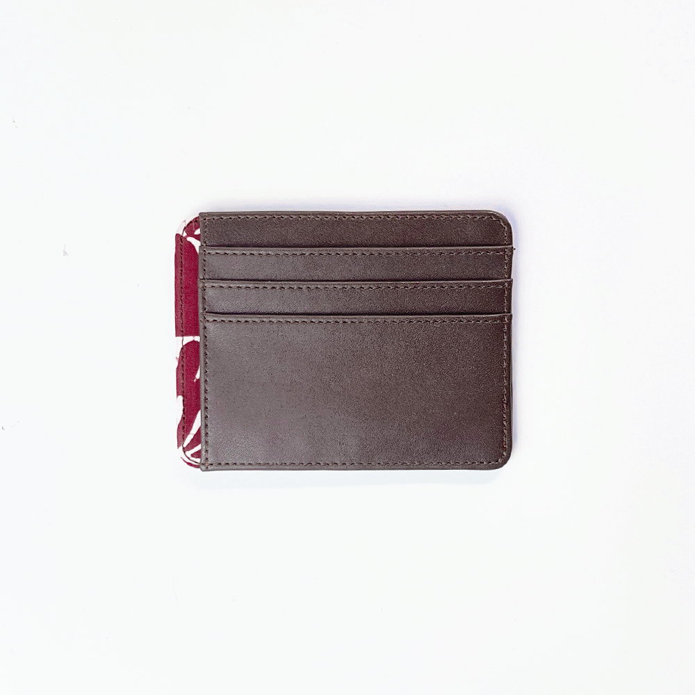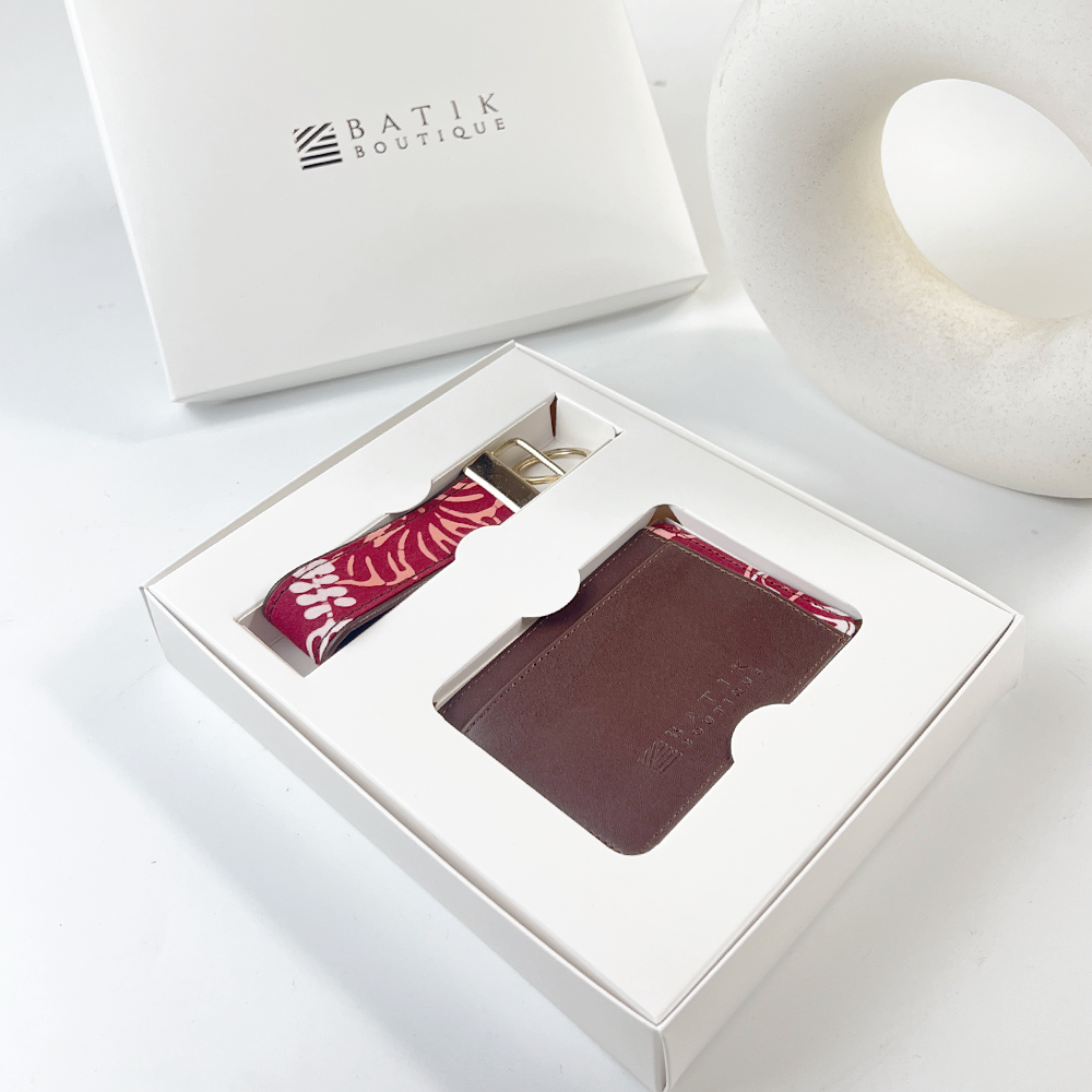 • Material: Made with a PU leather exterior and lined with genuine Malaysian batik, this card case features 4 card slots on the front, 1 slot on the back, 1 side slot for cards or cash, and a debossed Batik Boutique logo on the back.