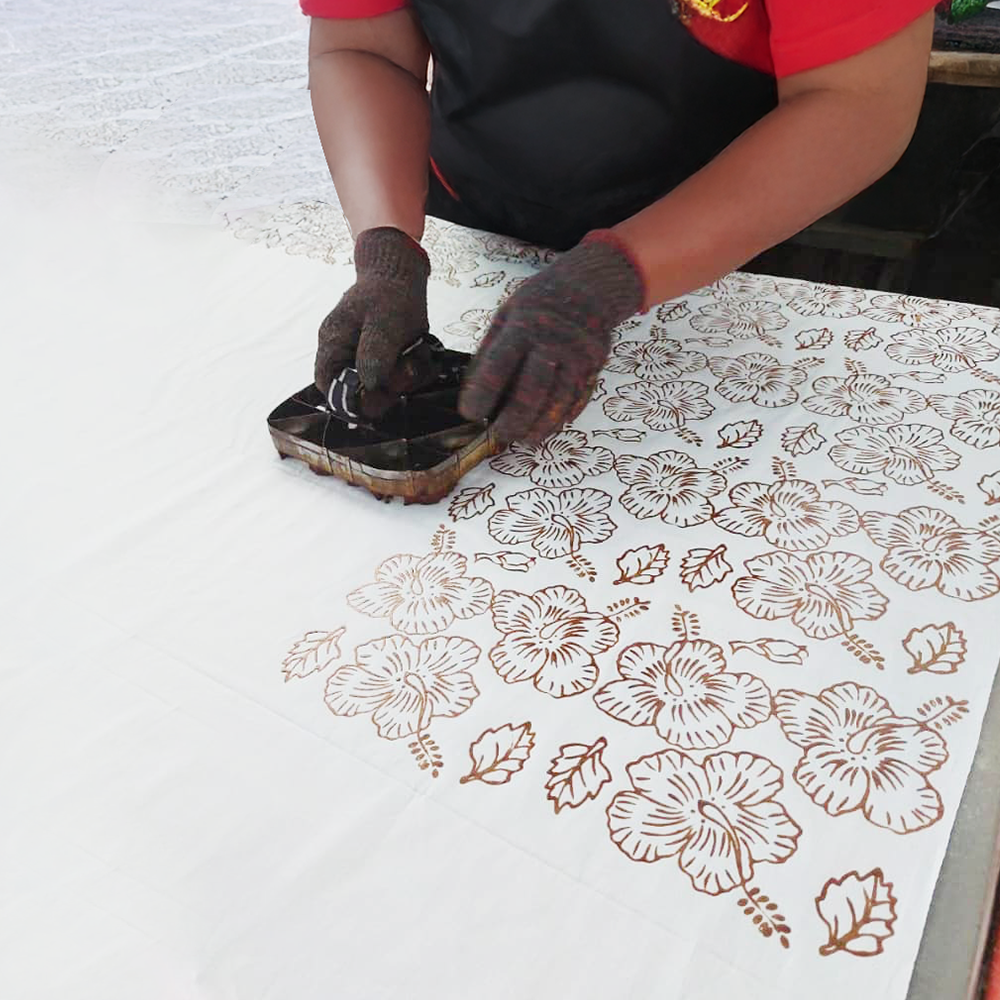 Inspired by the hibiscus, this classic batik pattern celebrates Malaysia’s national flower and its symbolism of unity and cultural pride. It is created using the traditional batik hand-chop technique, where wax is carefully stamped to preserve the white details, the motif is then dyed by hand, and a final layer of wax and colour is applied to form the background. This three-stage process gives the design its depth and character, with each piece reflecting the care and craftsmanship behind it.