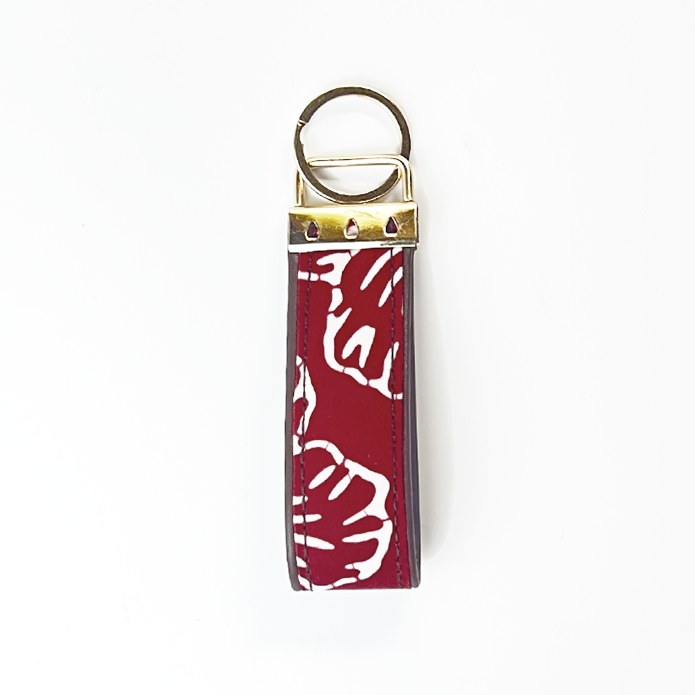 • Material: Durable PU leather wristlet with metal ring engraved with the Batik Boutique logo, handmade using remnant batik fabrics for an upcycled, sustainable accessory