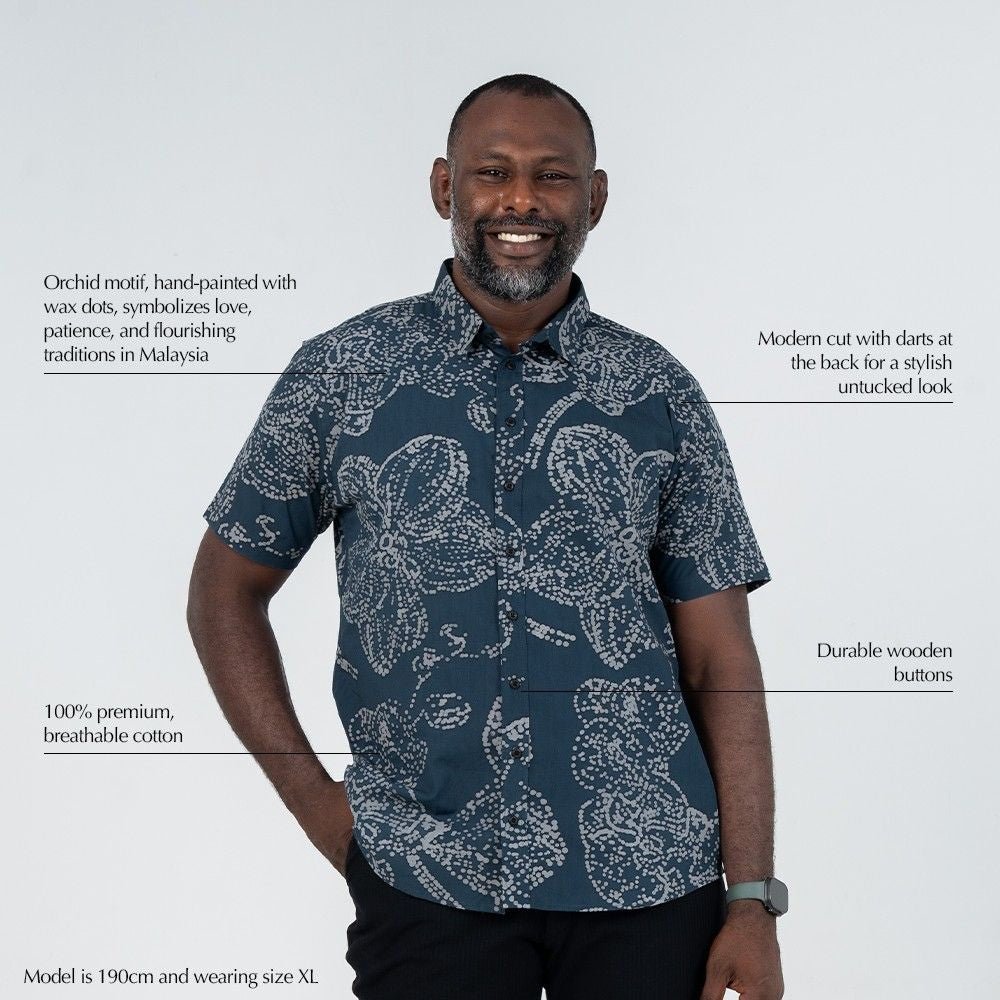 • The Navy Orchid showcases a stunning two-layered batik design, meticulously hand-painted in sophisticated shades of deep blue and grey