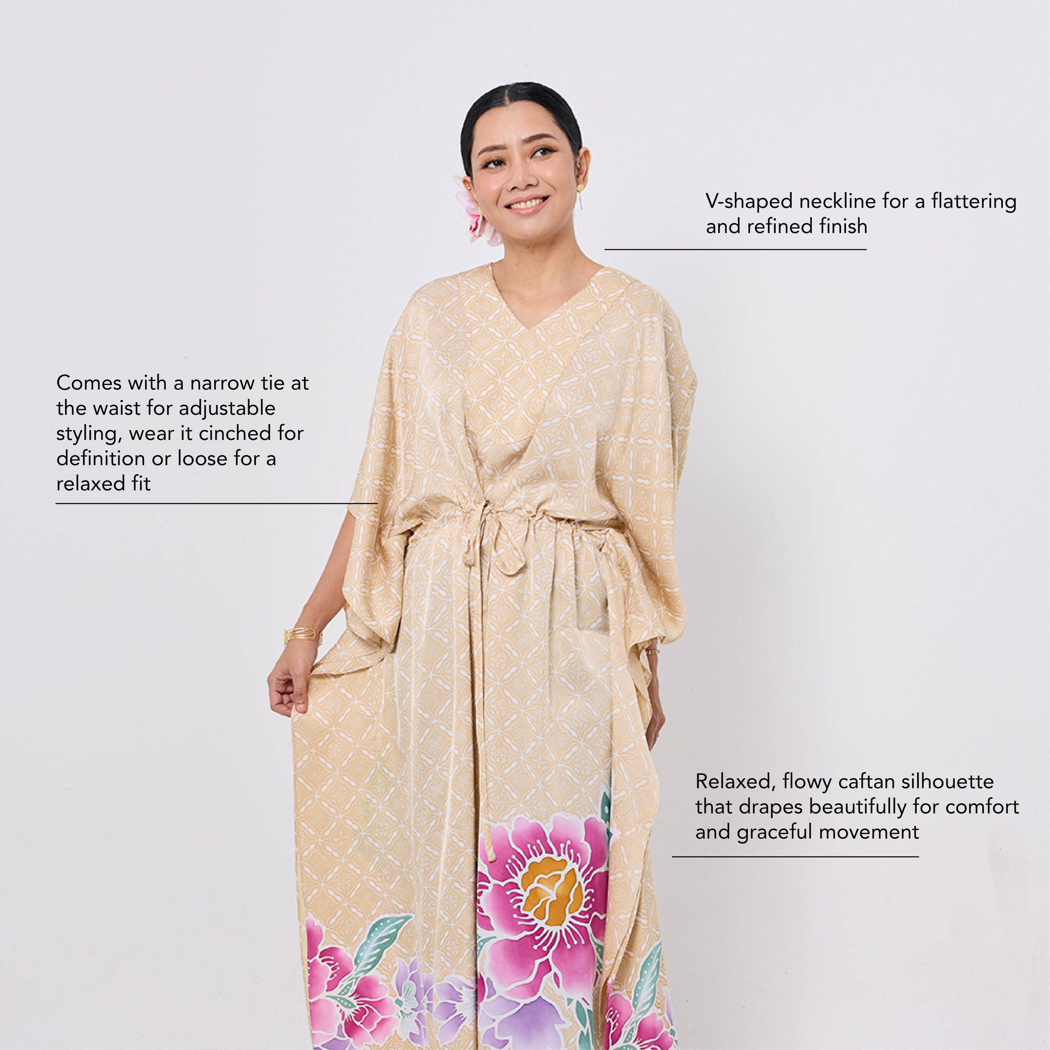 Add Batik Boutique’s Alysya Caftan to your wardrobe, blending cultural artistry with contemporary design.